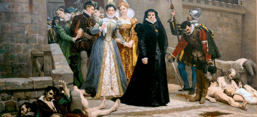Illustration Tableau d'Edouard Débat-Ponsan qui décrit après la saint Barthélémy, la sortie de Catherine de Médicis à la porte du Louvre