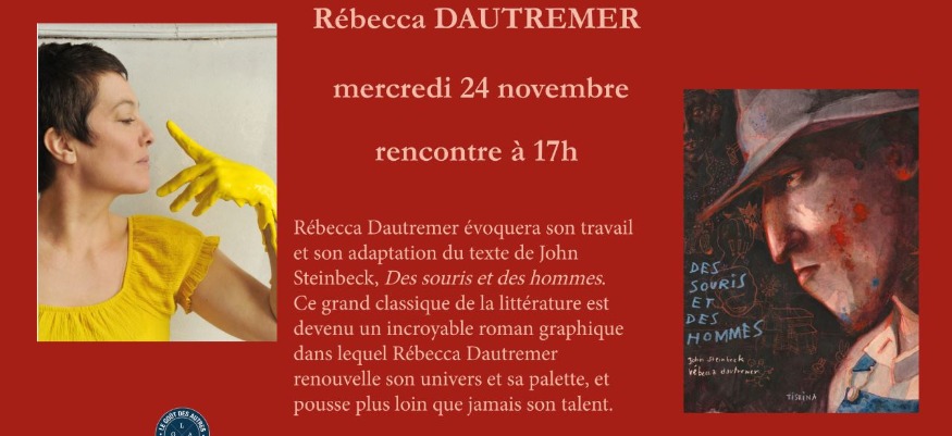 Rébecca Dautremer évoquera son travail et son adaptation du texte de John Steinbeck, Des souris et des hommes. Ce grand classique de la littérature est devenu un incroyable roman graphique dans lequel Rébecca Dautremer renouvelle son univers et sa palette, et pousse plus loin que jamais son talent.Rébecca Dautremer a écrit et illustré de nombreux albums parmi lesquels Midi Pile, Les riches heures de Jacominus Gainsborouugh, Princesses oubliées ou inconnues, L’Amoureux…