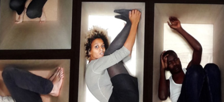 Frames, terme qui signifie à la fois « cadres », « images » d’une séquence filmée ou encore « silhouettes », est une oeuvre vidéo présentant des individus recroquevillés et contraints par la dimension des boîtes à l’intérieur desquelles ils évoluent.