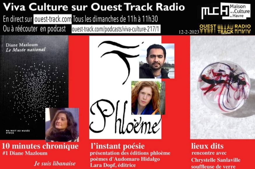INSTANT POESIE : Mathieu Amans : maison d'édition Les Phloèmes, poèmes d'Audomaro Hidalgo10 MN CHRONIQUE : Catherine Désormière : Diane Mazloum, Ma nuit au muséeLIEUX DITS Annie Drogou : Chrystelle Sanlaville, souffleuse de verreAU REVOIR agenda : au Théâtre des Bains Douches, le 14 février à 20h, La mécanique de l'ennui, Cie Les nuées ineffables, Festival En attendant l'éclaircie