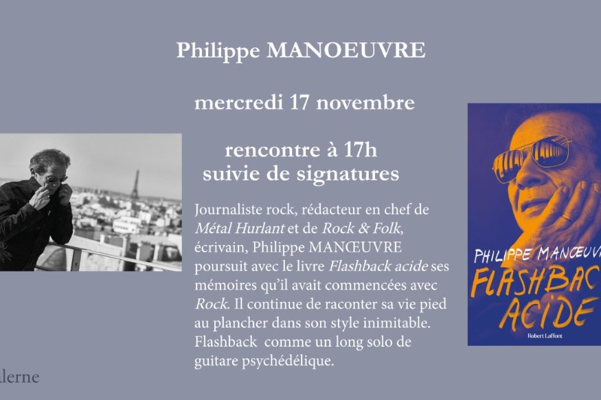 Journaliste rock, rédacteur en chef de "Métal Hurlant" et de "Rock&Folk", écrivain, Philippe Manœuvre poursuit avec le livre "Flashback acide" ses mémoires qu’il avait commencées avec "Rock". Il continue de raconter sa vie pied au plancher dans son style inimitable, et nous emmène à la rencontre des monstres sacrés, David Bowie, Iggy Pop, Lou Reed, Captain Beefheart, Lemmy de Motörhead, raconte sa plongée en URSS avec les Scorpions en 1988 avec les chars de l'armée russe derrière le rideau avant de livrer quelques chapitres plus personnels top secret.Flashback comme un long solo de guitare......