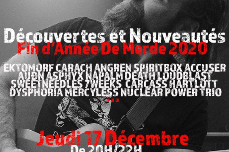 Emission du jeudi 17 décembre 2020 THEME: Nouveautés & Découvertes 2020 TRACKLIST:01 Carach Angren - Operation Compass 02 Ektomorf - Reborn 03 Spiritbox - Holy Roller 04 Finntroll - Forsen 05 Accuser - Phantom Graves 06 Auðn - Eldborg 07 Napalm Death - Backlash Just Because 08 Nuclear Power Trio - A Clear and Present Rager 09 Sweet Needles - Another Land 10 Carcass - Under the Scalpel Blade 11 7 Weeks - Intimate Hearts 12 Harlott - Idol Minded 13 Venomous Concept - Simian Flu 14 Mercyless - Laqueum Diaboli 15 Déluge - Soufre 16 Nervd - All I Need 17 Skeletal Remains - Congregation of Flesh 18 Insidious Disease - Betrayer 19 Paradise In Flames - Satan's......