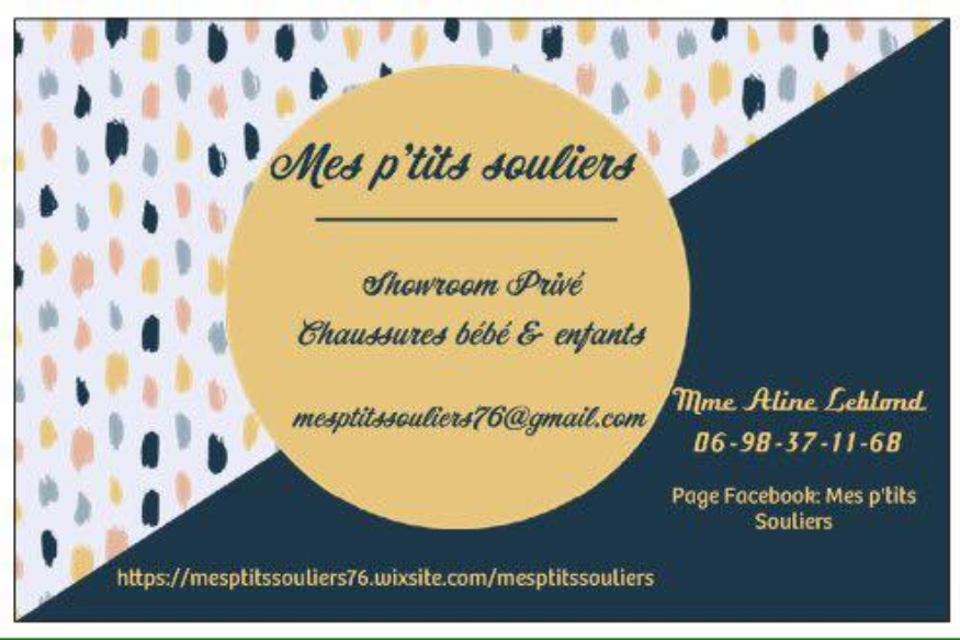 Mes p'tits souliers Une réponse au problème que peut poser l'approvisionnement en chaussures pour enfants Site internet : http://www.mesptitssouliers.com Page FB : https://www.facebook.com/Mes-ptits-Souliers-2000389520286408/ Coordonnées : 06 98 37 11 68 | mesptitssouliers76@gmail.com ...