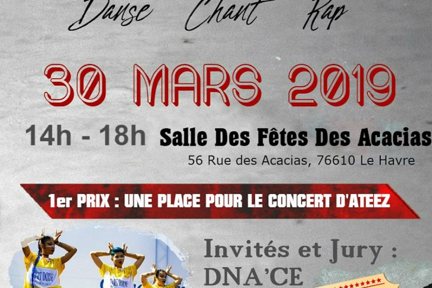 Concours musique, rap & danse d'Evénements K-Pop Le Havrepar Miyu, Bou, Nana et Mya, membres fondatrices de l'associationEvénements K-Pop Le Havre vise à promouvoir & faire connaitre la culture coréenne, grâce à l'organisation d'événements, musicaux notamment.Le prochain événement est un concours musique/rap/danse, où s'affronteront 12 participant.e.s. Places de concert & T-shirt seront à gagner!RDV à la salle des fêtes des Acacias, 56 Rue des Acacias, 76610 Le HavreRetrouvez Evénements K-Pop Le Havre sur les réseaux sociaux......