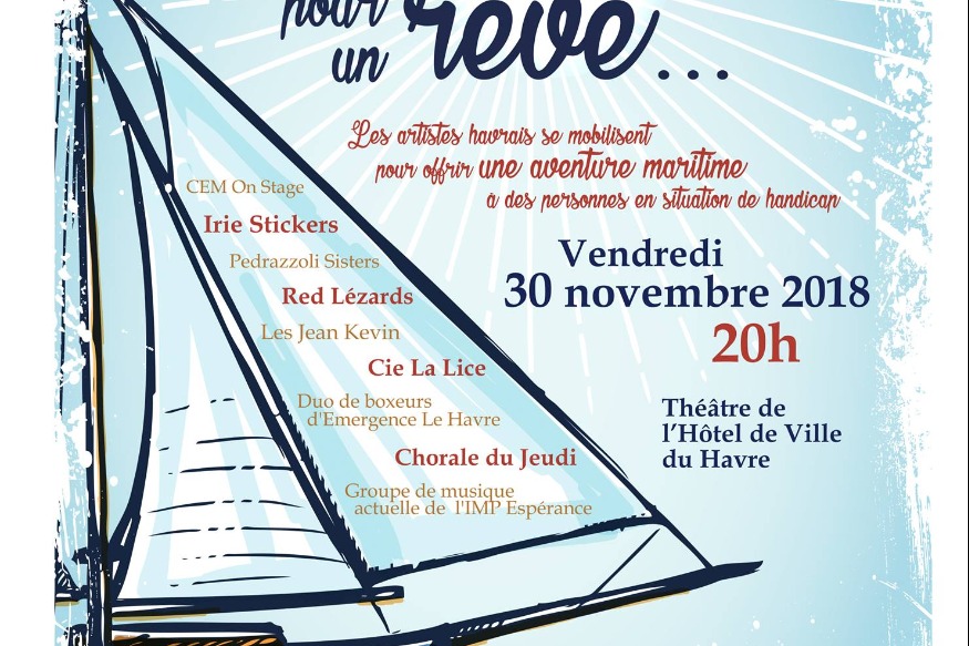 Le Rotary Club Le Havre Océane et ses partenaires sont heureux de vous convier au concert-spectacle "Des voiles pour un rêve". L'objectif de cette soirée est de lever des fonds afin d'offrir des baptêmes marins à des enfants et adultes handicapés. Ces baptêmes seront réalisés par l'intermédiaire de l'association Normhandimer qui possède un bateau permettant notamment à des enfants en fauteuil de naviguer. >>> https://www.facebook.com/events/416697692197792/