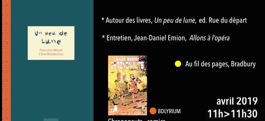 CONSEIL DE LECTURE AVEC LA LIBRAIRIE AU FIL DES PAGES : SAUVAGE DE JAMIE BRADBURY EDITION GALLMEISTER AUTOUR DES LIVRES : UN PEU DE LUNE DE FRANCISCO MOUAT ET CLARA MONTECINOS EDITION RUE DU DEPART ENTRETIEN AVEC JEAN DANIEL EMION POUR ALLONS A L'OPERA DERNIER CONSEIL DE LECTURE AVEC LA LIBRAIRIE BDLYRIUM POUR CHRONONAUTS DE MARC MILLAR ET SEAN MURPHY