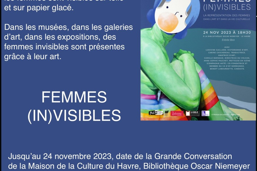 Dans les collections des musées, dans les galeries d’art, les femmes sont visibles sur toile et sur papier glacé. Dans les musées, dans les galeries d’art, dans les expositions, des femmes invisibles sont présentes grâce à leur art. A l’occasion de la Grande Conversation, organisée le 24 novembre 2023, à 18h 30, à la bibliothèque Oscar Niemeyer au Havre, (In)visible évoque, en un clin d’œil, des figures de femmes peintres, sculptrices, performeuses.