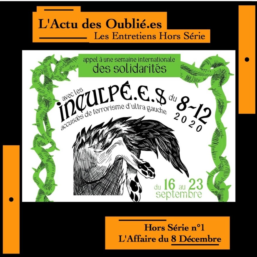 L'affaire du huit décembre, c'est l'histoire de sept personnes inculpées pour association de malfaiteurs terroristes dont le procès commence le 3 octobre prochain. Pour avoir été soupçonnées par la DGSI d'un projet d'attaque contre les forces de l'ordre, et malgré une enquête qui n'a jamais su apporter la moindre preuve d'un tel projet, ces sept personnes sont soumises à une procédure d'une extrême violence.